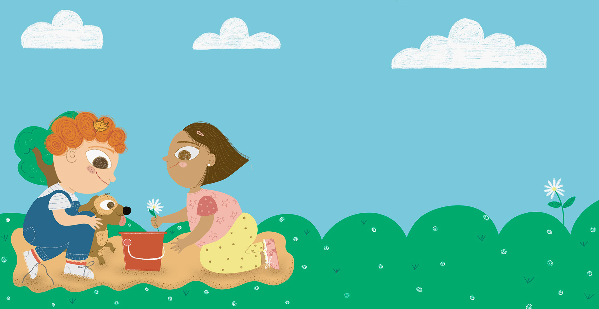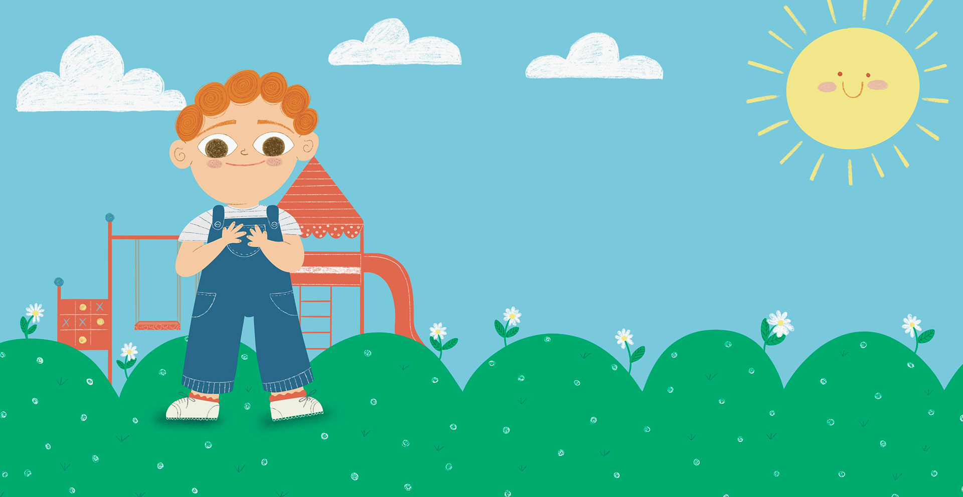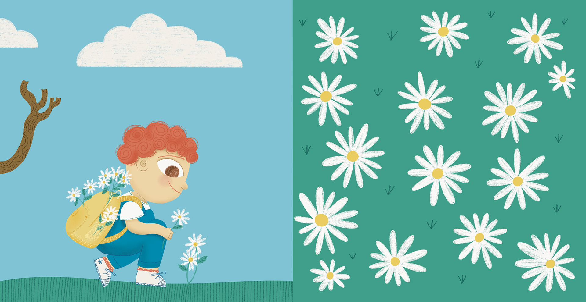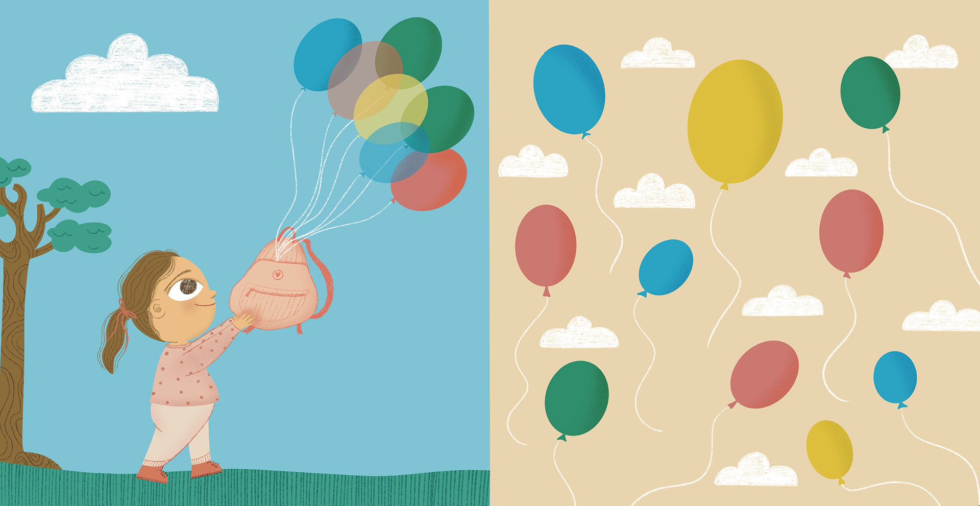Cartone para primera infancia (0-2 años) Dobles paginas pensadas para la primera experiencia con el libro: escenas cotidianas al aire libre, figuras claras y acciones reconocibles que invitan a señalar, nombrar y acompañar con la palabra.