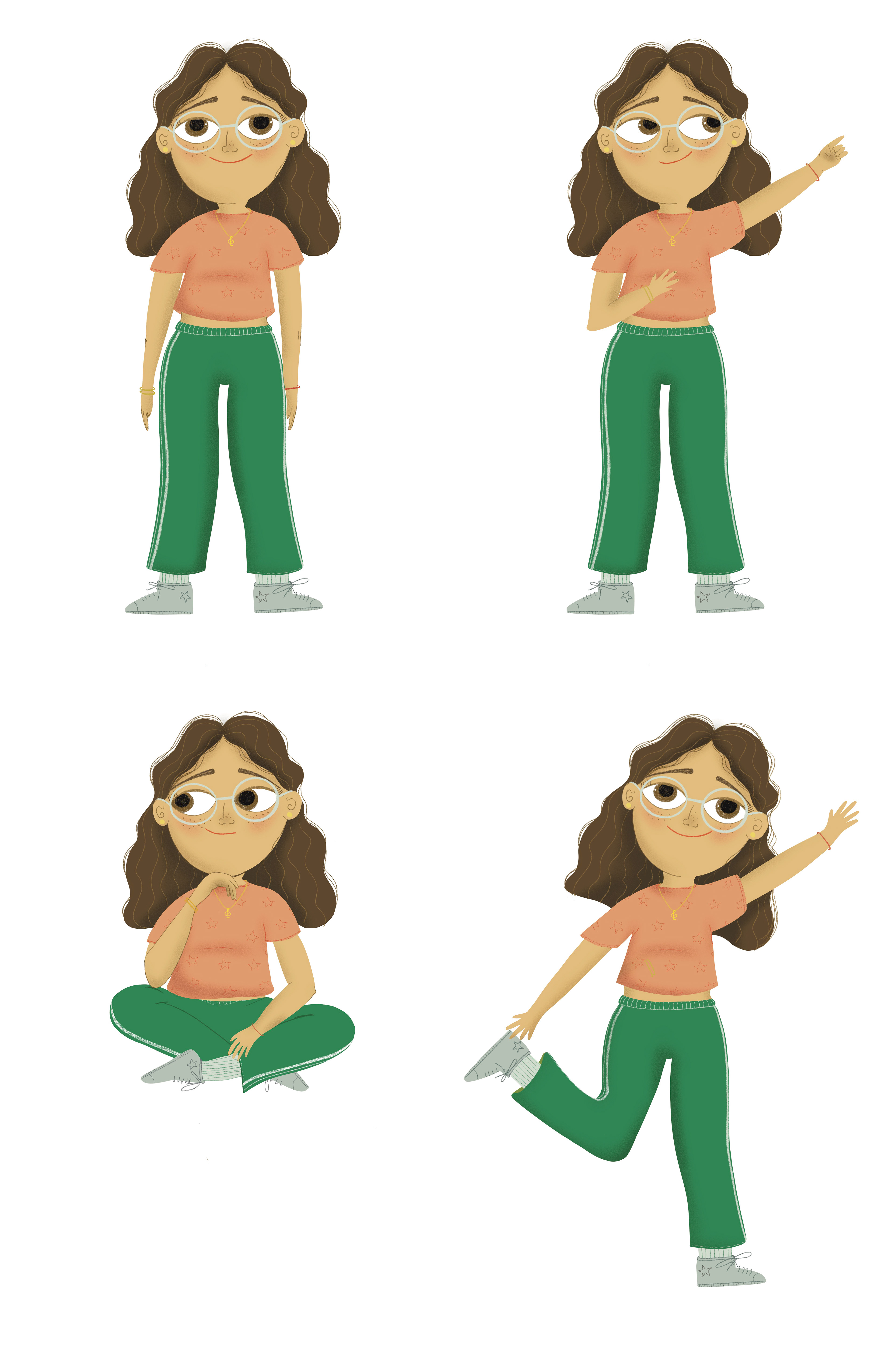 Adolescente femenina con rasgos venezolanos. Posturas: frente, señalando, sentada pensativa, divertida.